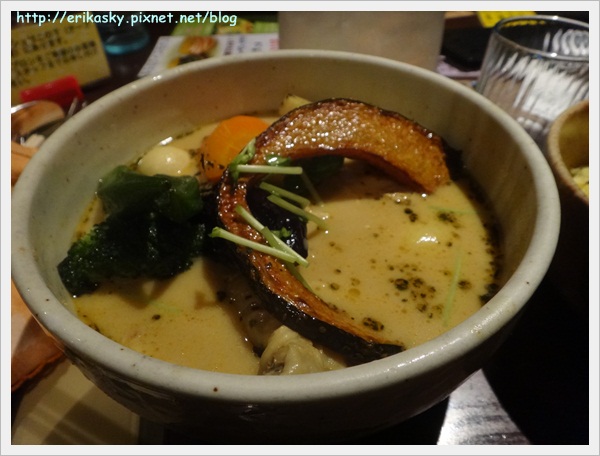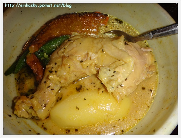 我是點 雞大腿咖喱 (チキン)950日元(雞大腿,土豆,胡蘿蔔,青椒,蓮藕,茄子,鵪鶉蛋)