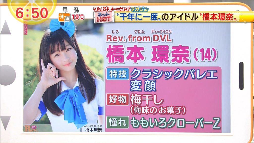 感想:這幾天在網路上相傳的日本美女童星橋本環奈,在影片中就可以很清楚的看的出來跟別人的差異,那特別的表情和長相可能有點外國混血的血統吧,整體讓人感覺非常治癒和舒適,像個天使下凡的美人,希望她未來演藝的發展能夠穩定,希望能夠朝向電視圈演戲發展,在團體中能出頭的我覺得就只有在AKB48吧。