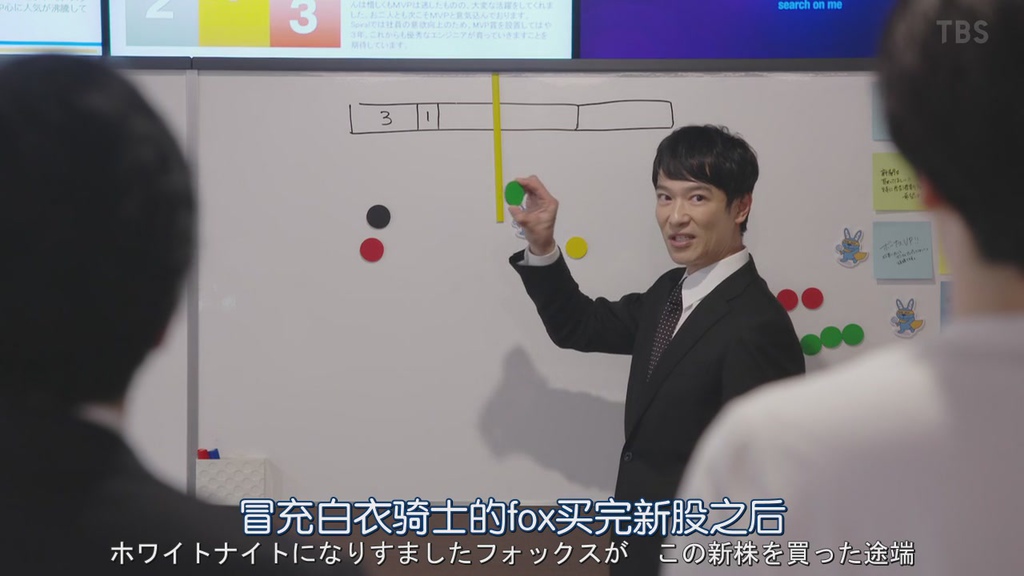 最後這是證券和銀行的戰爭,因為知道幫忙出資的投資者有跟母公司銀行掛勾,一旦股份被轉移到電腦,電腦即將佔大部分股份,可以把S公司併吞,那絕對不行讓他收購,因為收購後等於他的公司就被別人買走,半澤講解後面那段長條圖是不是沒有把他擦掉